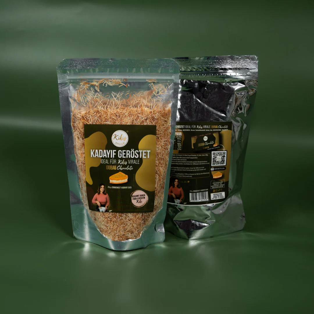 Rezept: (pro Tafel): 4 EL Kadayif, 4 EL Kikis Cream Pistachio, 2 EL Kikis Tahini, 200g